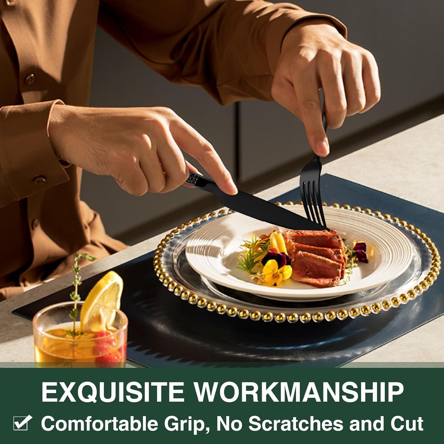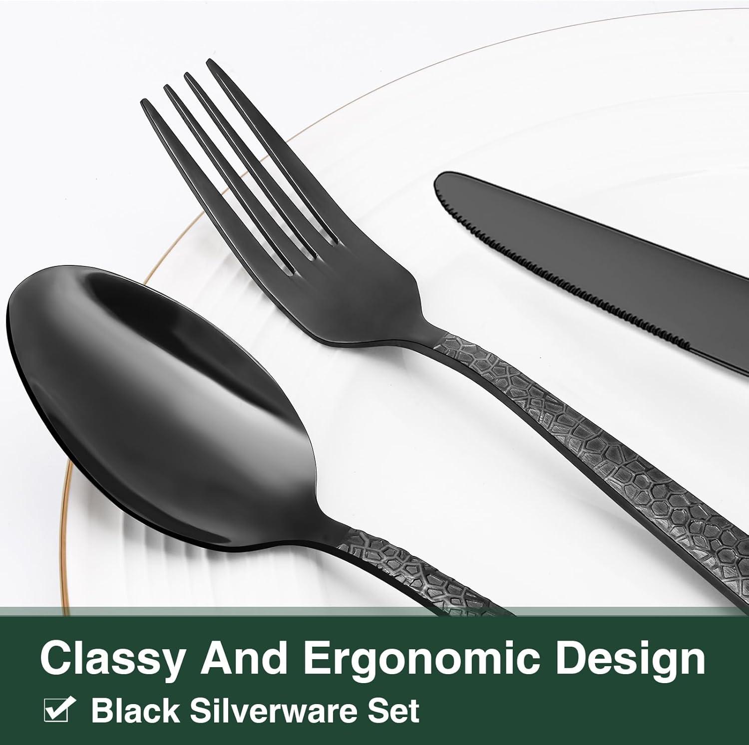 COMFORTABLE DESIGN: This flatware set has a classic silhouette with clean lines and polish-finish surface in all black, a good choice to go with your existing tableware. The smooth edge of the handle is pleasure to hold, appropriate weight and perfect balance are added to ensure maximum comfort during use.