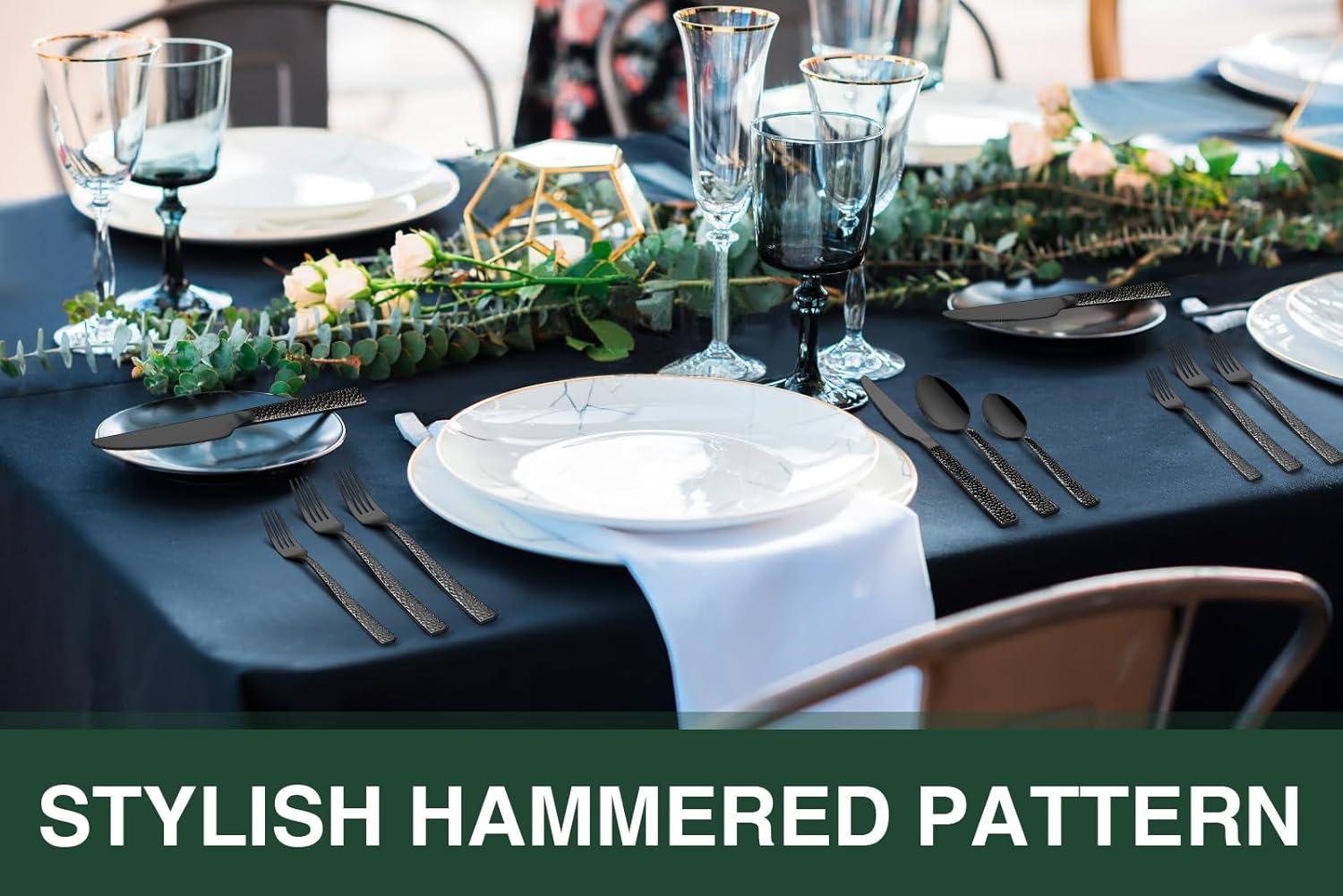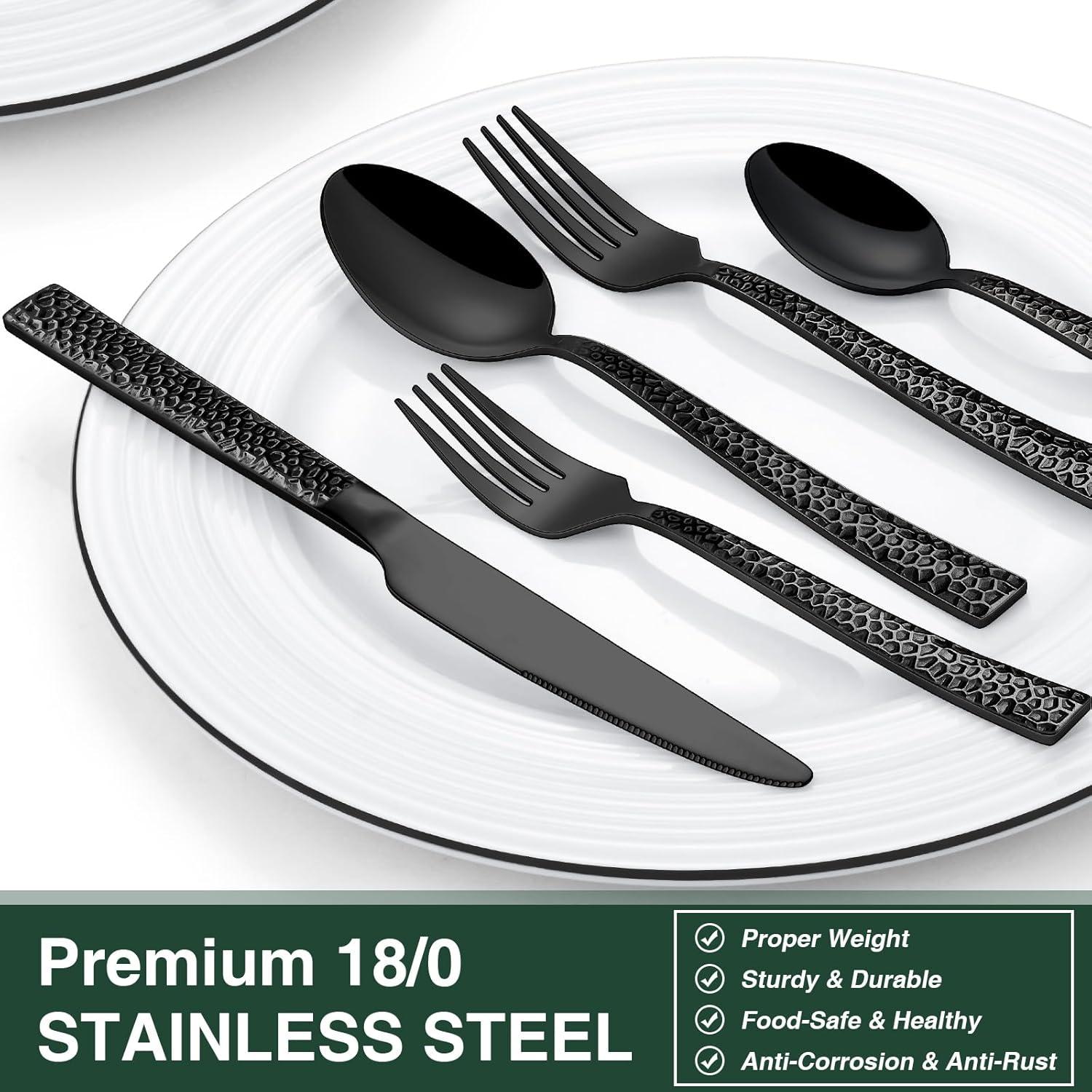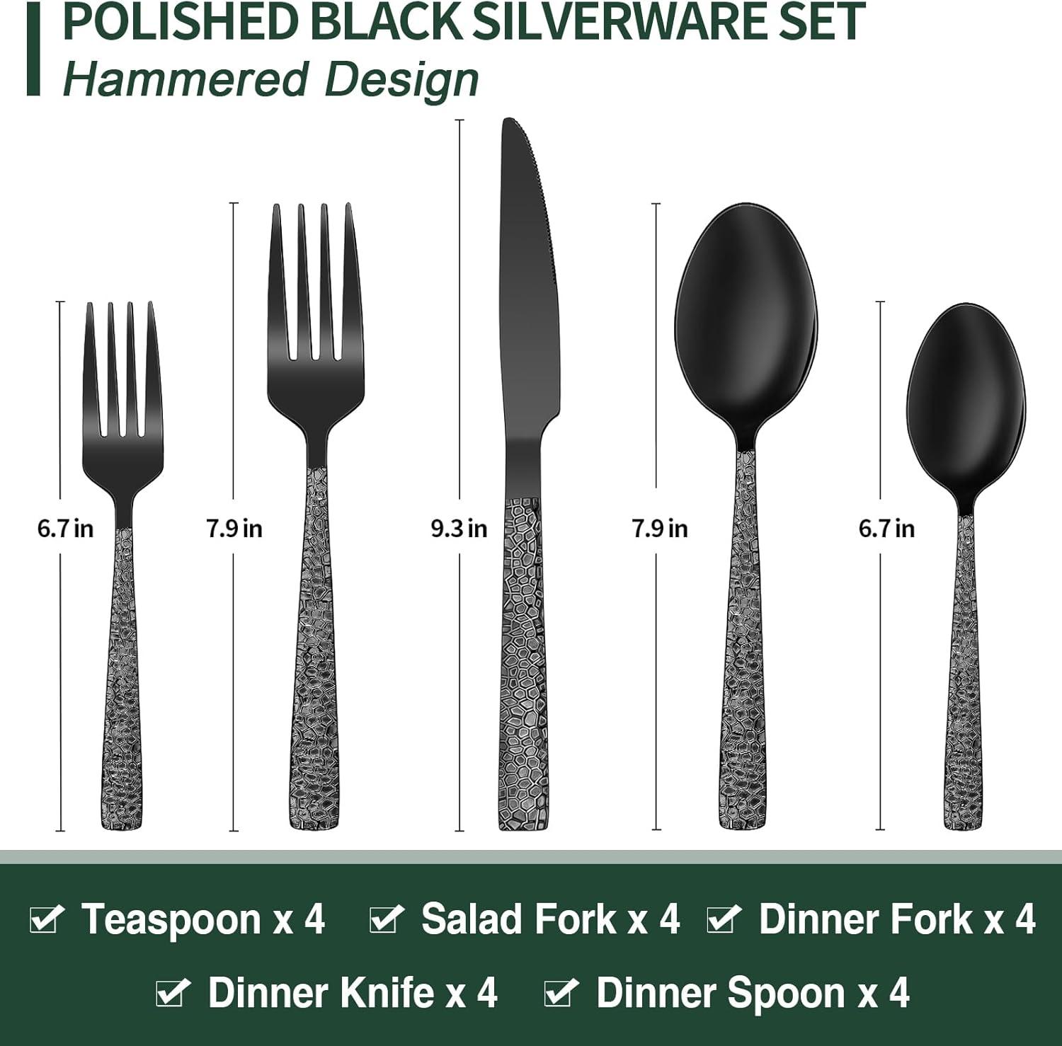 Black Hammered Silverware Set, 20-Piece Stainless Steel Square Flatware Set for 4, Food-Grade Tableware Cutlery/Utensil Sets for Home Restaurant, Mirror Finish, Dishwasher Safe(Hammered Edge)