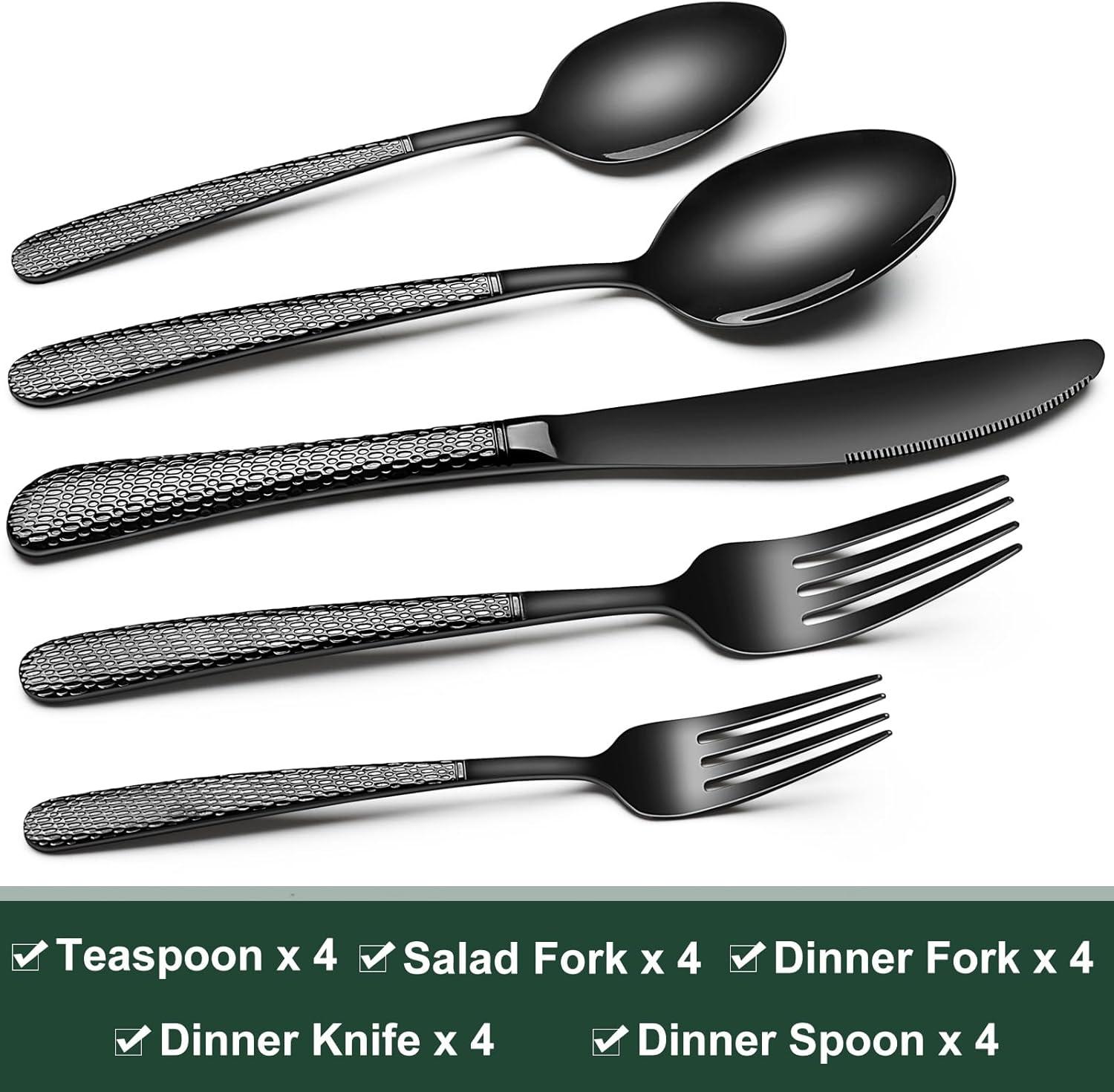 PREMIUM 20-PIECE BLACK SILVERWARE SET FOR 4: This flatware set contains 4 dinner forks, 4 salad forks, 4 dinner spoons, 4 dessert spoons, 4 dinner knives. It’s the ideal set for home daily use, and also for restaurants, pubs, cafes, and hotels. This cutlery set also help your dinner full of design while having a party.